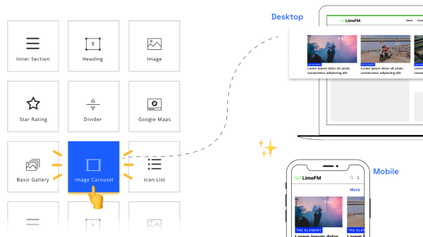 Choose from a rich library of pre-built, responsive elements, integrate media and social feeds, and watch your creation come to life with real-time preview on any device (phone, tablet, laptop, or big screen).